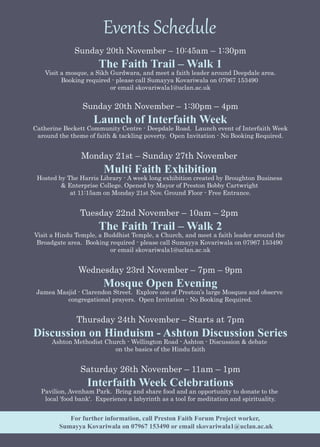 This document announces the schedule of events for Interfaith Week 2011 in Preston from November 20-27. The week aims to promote discovery of the area's multifaith society through articles in the local newspaper and a variety of events, including faith walks to different houses of worship, exhibitions at the library and mosques, and discussions on Hinduism and tackling poverty from an interfaith perspective. Contact information is provided for more details.