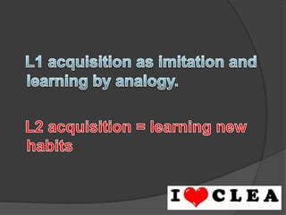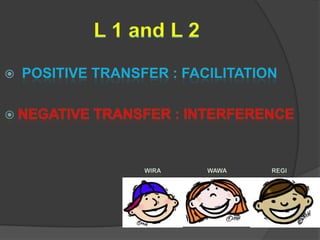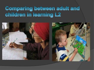 This document discusses reasons for learning a second language (L2) and challenges that arise, comparing learning an L2 like English to one's native first language (L1). It notes that learning an L2 can be difficult due to differences in grammar, sounds, vocabulary compared to one's L1. Effective L2 learning requires practice and is influenced by one's knowledge of language, age when learning begins, whether instruction is explicit, and the level of attainment achieved compared to an L1 learner.