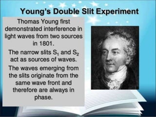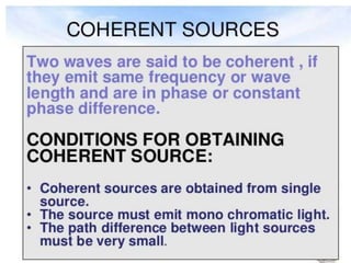Two loudspeakers connected to the same signal generator produce sound waves of the same wavelength. When a person walks in front of the loudspeakers, they hear the resultant interference effect. At some points, the sound waves arrive in phase and constructively interfere to produce louder sound. At other points, the waves arrive out of phase and destructively interfere, producing silence. The distance between bright or dark fringes on a screen is called the fringe width and can be calculated using the wavelength, distance between slits, and distance from slits to screen.