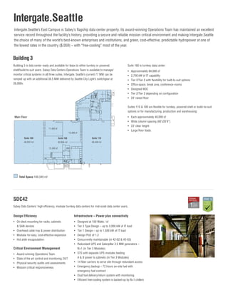 Sabey Data Centers operates three data center campuses in the Seattle area totaling over 1.4 million square feet of space. The East Campus features turnkey data center suites ranging from 48,000 to 64,000 square feet as well as a massive 566,000 square foot Building 5 data hall. Sabey offers flexible colocation, powered shell, and build-to-suit options supported by industry-leading critical systems, connectivity, and operational management.