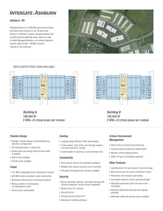 Intergate.Ashburn is a 490,000 square foot data center campus on 38 acres in Ashburn, Virginia. The campus consists of three buildings that can provide powered shell or turnkey colocation spaces between 500-20,000 square feet. Leasing is underway for flexible spaces that have ample power and cooling capacity as well as carrier-neutral connectivity options. The data center is designed and built by Sabey Construction, an affiliate of Sabey Data Centers known for technical and mission critical projects.