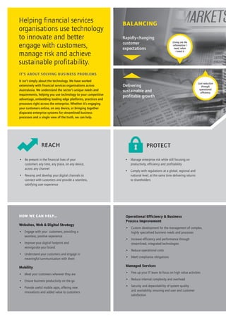 The document outlines the strategic transformation in the financial services sector driven by technology, which presents both challenges and opportunities for engaging customers and managing risks effectively. It emphasizes the importance of leveraging information and operational efficiency to remain profitable, all while meeting rapidly changing customer expectations for personalized service and transparency. Intergen provides Microsoft technology solutions to help financial organizations innovate, comply with regulations, and achieve sustainable profitability.