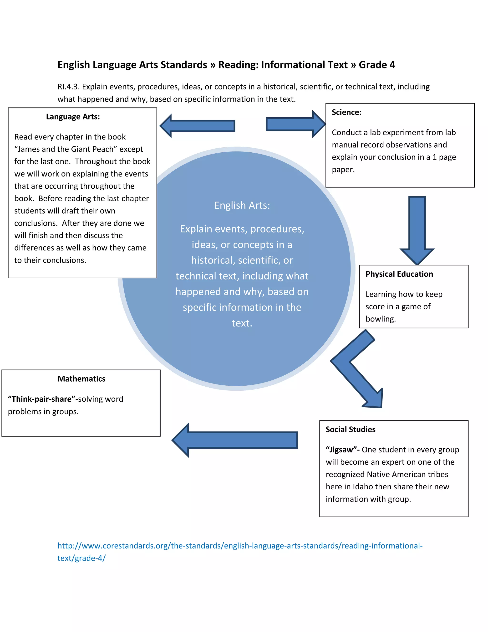 RI.4.3 explains that students should be able to explain events, procedures, ideas, or concepts in a historical, scientific, or technical text. This includes explaining what happened and why, based on specific information found in the text. Students are expected to understand and recount the key details and events from an informational text and explain the reasons behind them using evidence from the text.