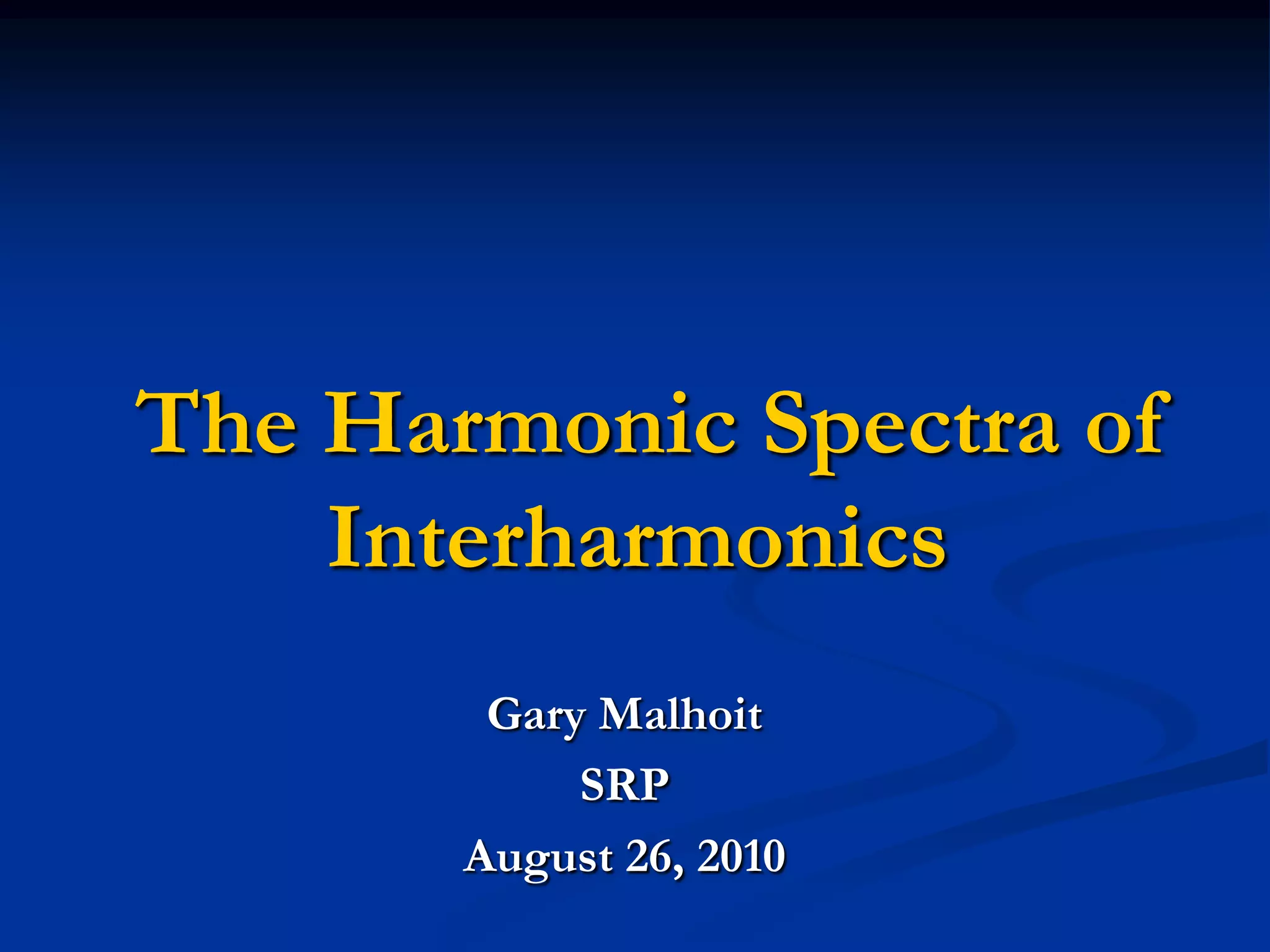 This document provides an overview of harmonics and interharmonics, including their definitions, causes, impacts, and measurement. Interharmonics are frequencies that are not integer multiples of the fundamental power system frequency. They can be caused by non-linear and time-varying loads like variable speed drives, arc furnaces, and cycloconverters. Interharmonics can cause issues like light flicker and equipment heating. While difficult to measure due to their non-periodic nature, standards like IEC 61000-4-7 define methods to quantify interharmonics through frequency groupings. Understanding interharmonics is increasingly important as power electronics continue to generate more interharmonic distortion on power systems.