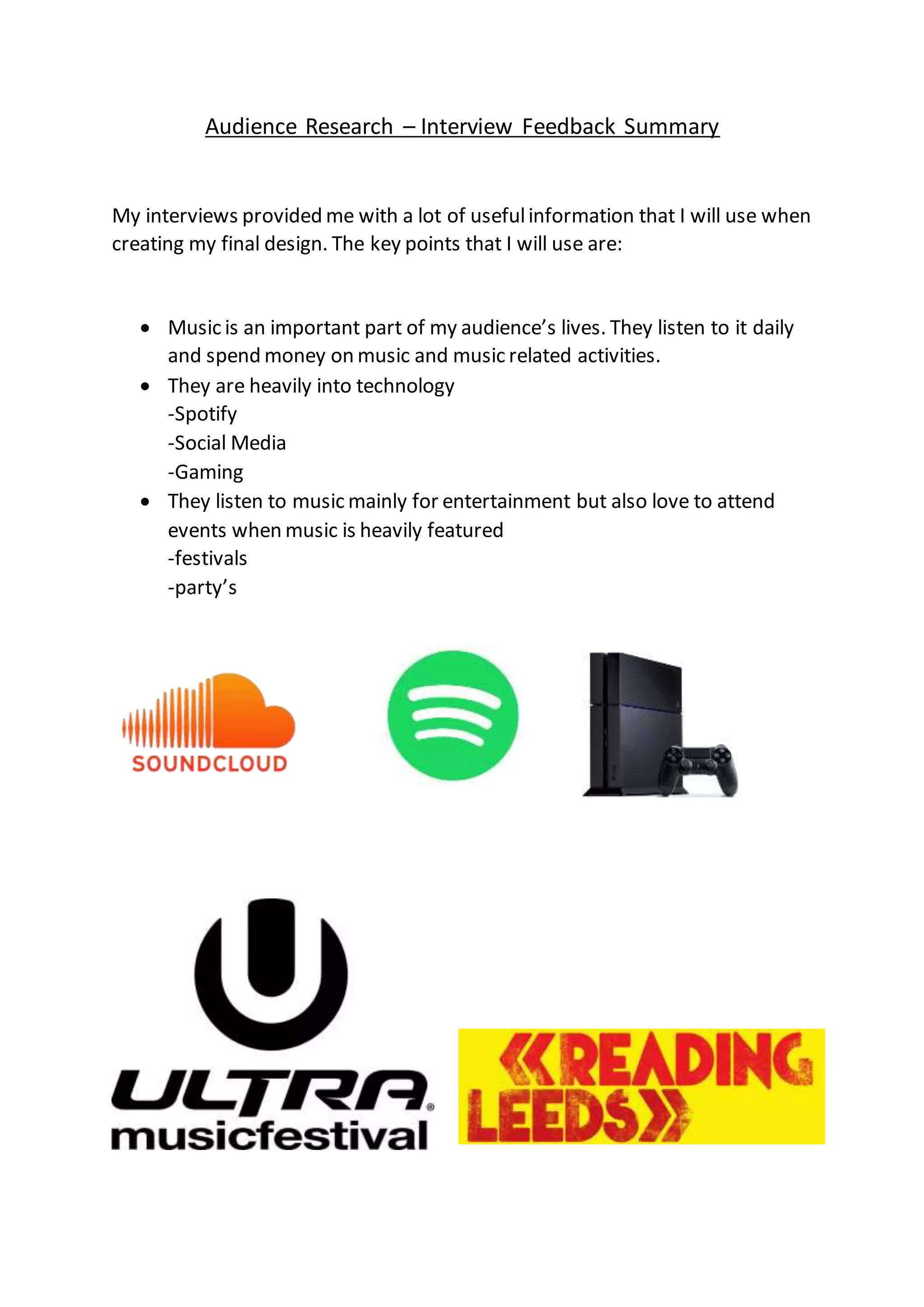 The interviews provided key insights about the target audience: they listen to music daily and spend money on it and related activities. They are heavily invested in technology like Spotify, social media, and gaming. The audience listens to music primarily for entertainment but also enjoys attending music-focused events like festivals and parties.