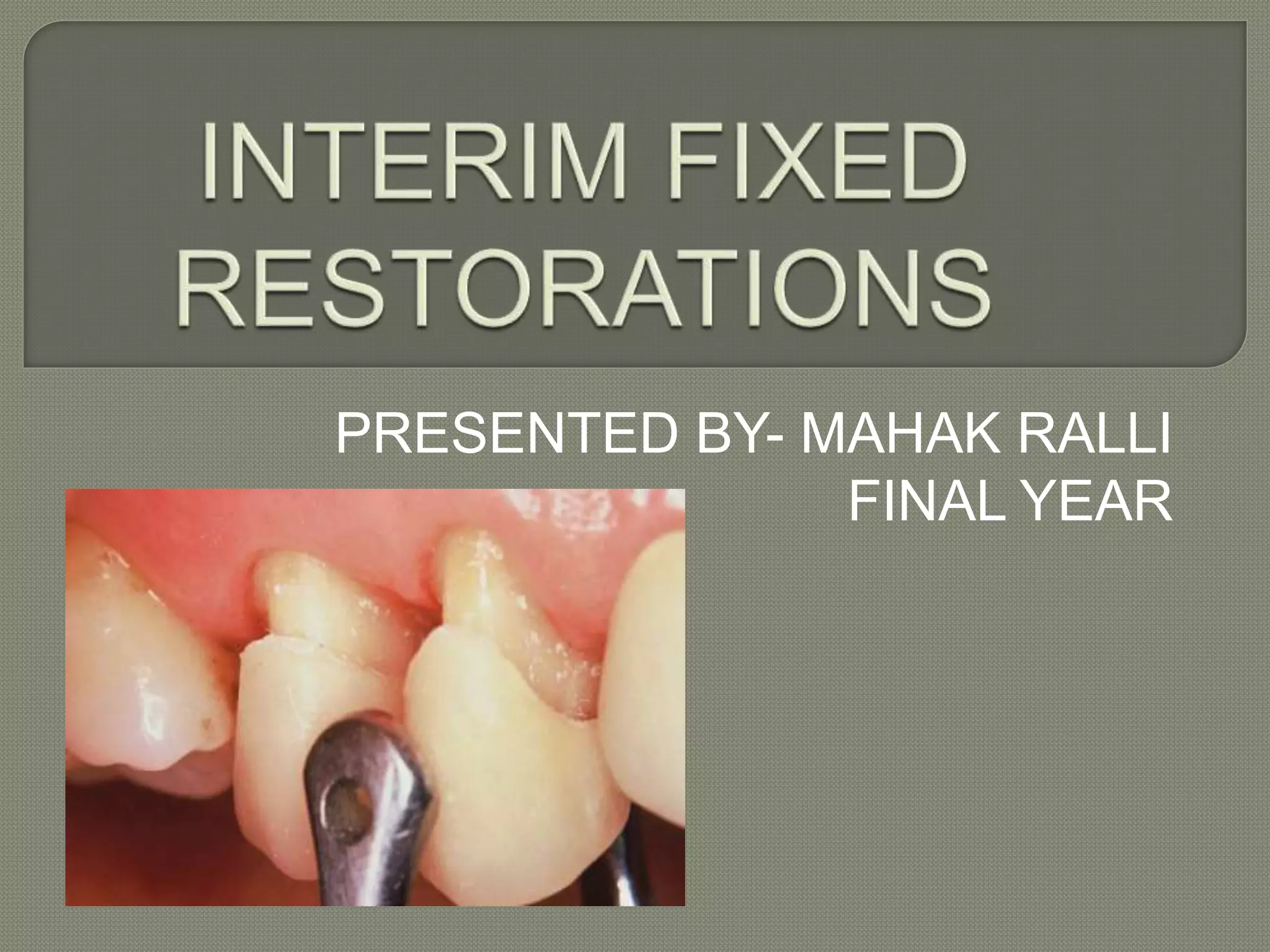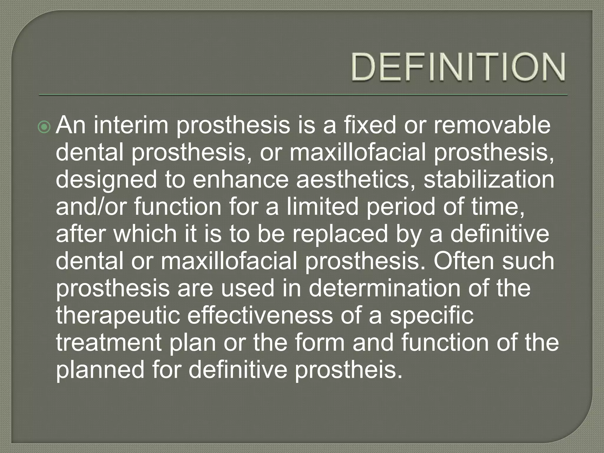 An interim prosthesis is a temporary dental restoration used while determining the effectiveness of a treatment plan or design of a definitive prosthesis. It must satisfy patient and dentist needs by protecting pulp, maintaining oral health, and establishing proper occlusion. Interim restorations can be custom made using impressions or prefabricated shells that are later adjusted. The direct technique forms the restoration directly in the mouth while indirect techniques use models to improve fit and reduce risks.