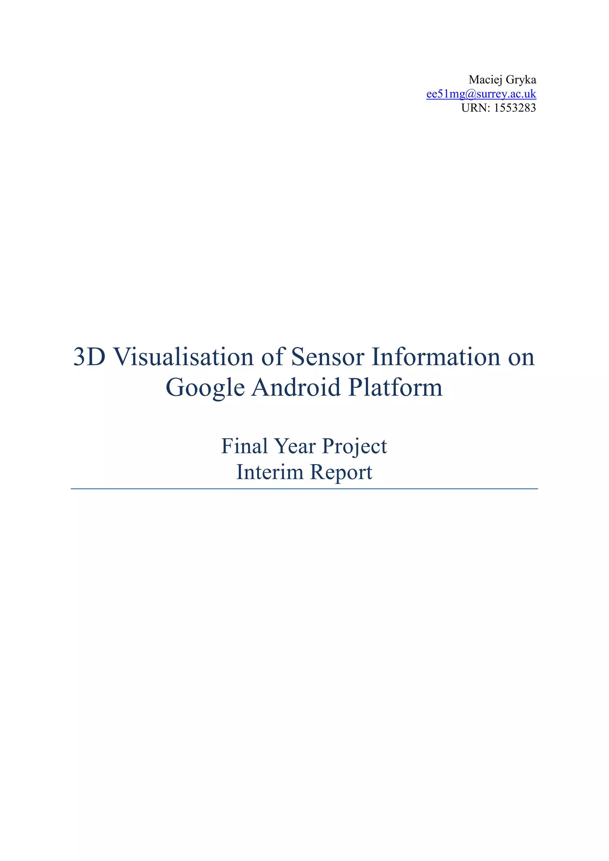 This document provides a midterm report on a final year project to develop a 3D visualization Android application to display sensor data stored in an OWL format repository. It outlines the project objectives of developing an application in Java using the Android SDK that can retrieve and display updated sensor readings from a building model in 3D. The report describes the tools used, including the Android SDK and Eclipse IDE. It also reviews literature on software development methodologies and similar projects for gathering requirements and designing the application. The work completed so far is documented and future work plans are presented.