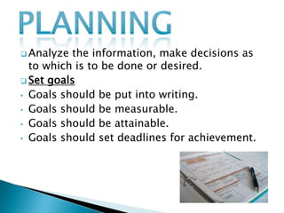 1. Analyze information and set goals that are written, measurable, attainable, and have deadlines.