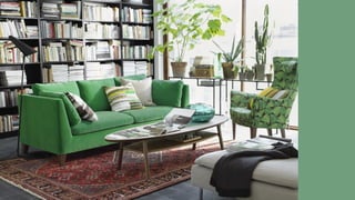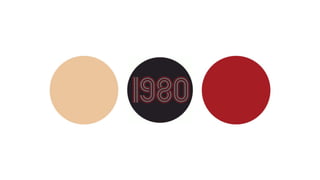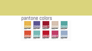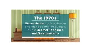 The document provides an overview of interior design styles from 1960-2010. It describes key influences, furniture, colors, and textures for each decade. In the 1960s, styles were eclectic and experimental as designers combined elements from the past. The 1970s saw the rise of open floor plans, wood paneling, and earth tones inspired by nature. Bold colors, reflective surfaces, and minimalism characterized the 1980s. The 1990s featured a more minimalist aesthetic with natural colors and pine furniture.