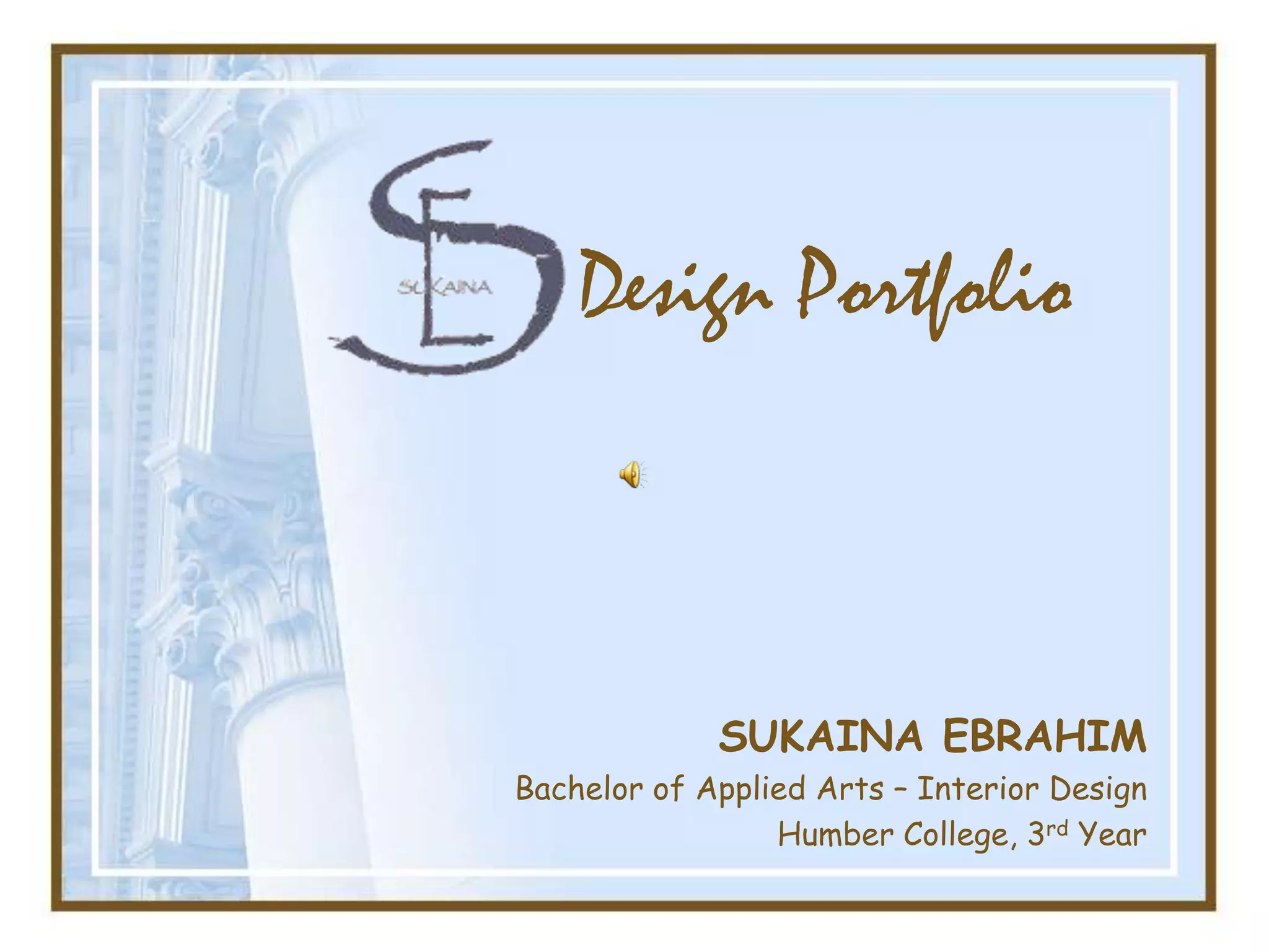Sukaina Ebrahim's design portfolio features 6 projects from her 3rd year of study in Interior Design at Humber College. The projects include an office space for Amnesty International focused on conveying warmth and comfort, a residential loft with hand drawings, a gift store celebrating the history and vibrancy of its neighborhood, a mobile oncology clinic conceptualized as a journey by sea, a winery crossing borders between Canada and the US, and a display unit representing diversity through student-designed cubes.