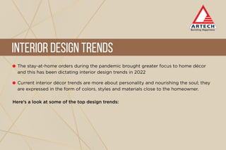Interior design trends in 2022 emphasize personal expression and comfort, influenced by the stay-at-home orders during the pandemic. Key trends include biophilic décor that incorporates natural elements, a shift toward green hues, the use of vintage furniture alongside contemporary styles, and a focus on sustainability by prioritizing local shopping. Overall, these trends reflect a desire for spaces that nourish the soul and are environmentally conscious.