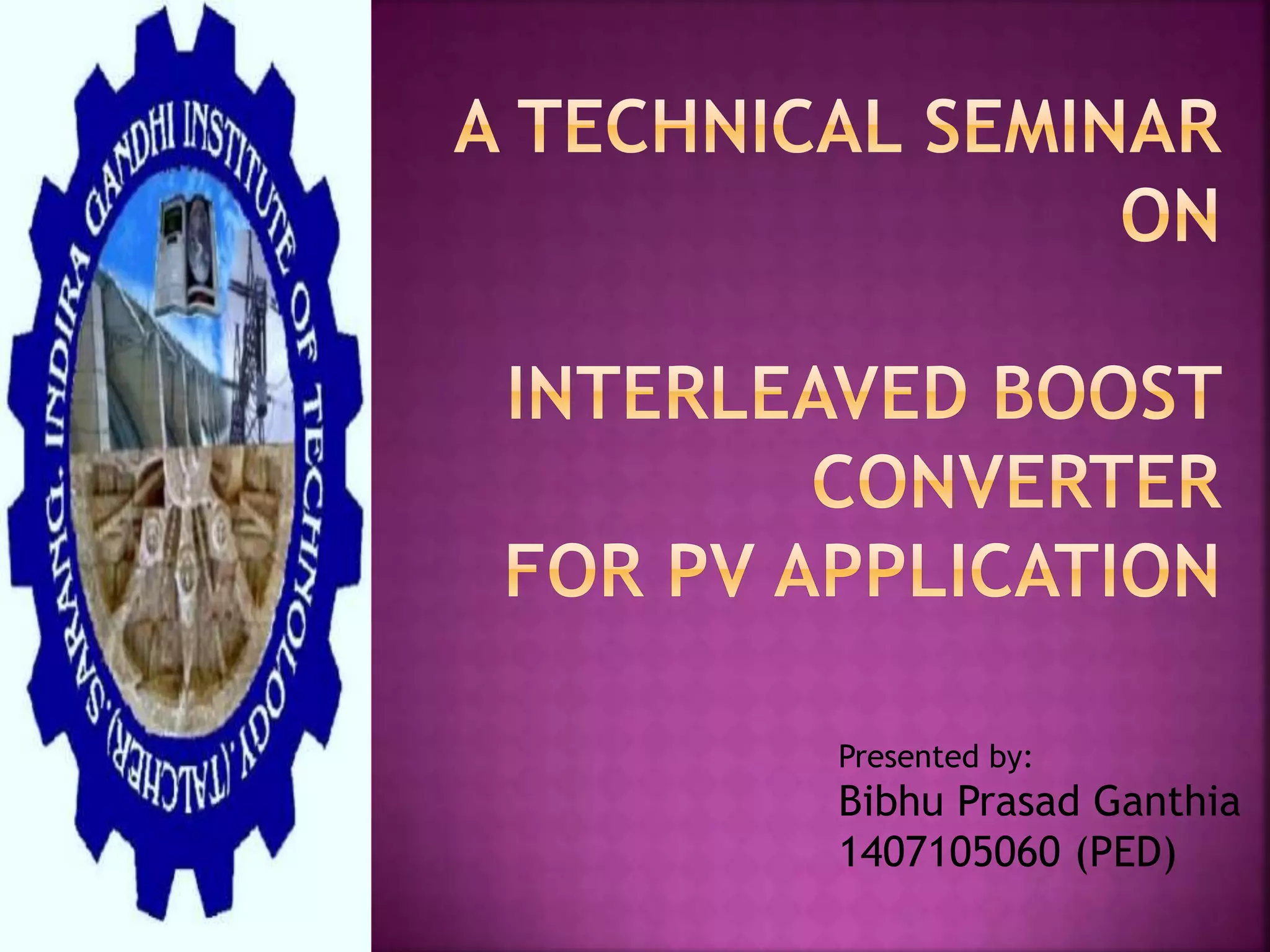 This document presents a schematic block diagram of a photovoltaic system with an interleaved boost converter and maximum power point tracking using the perturbation and observation method. It includes a single diode model of a PV cell and discusses the charging and discharging modes of operation of the boost converter. Simulation waveforms are presented showing the improvement with MPPT control. Future work will involve designing a closed loop inverter for grid synchronization.