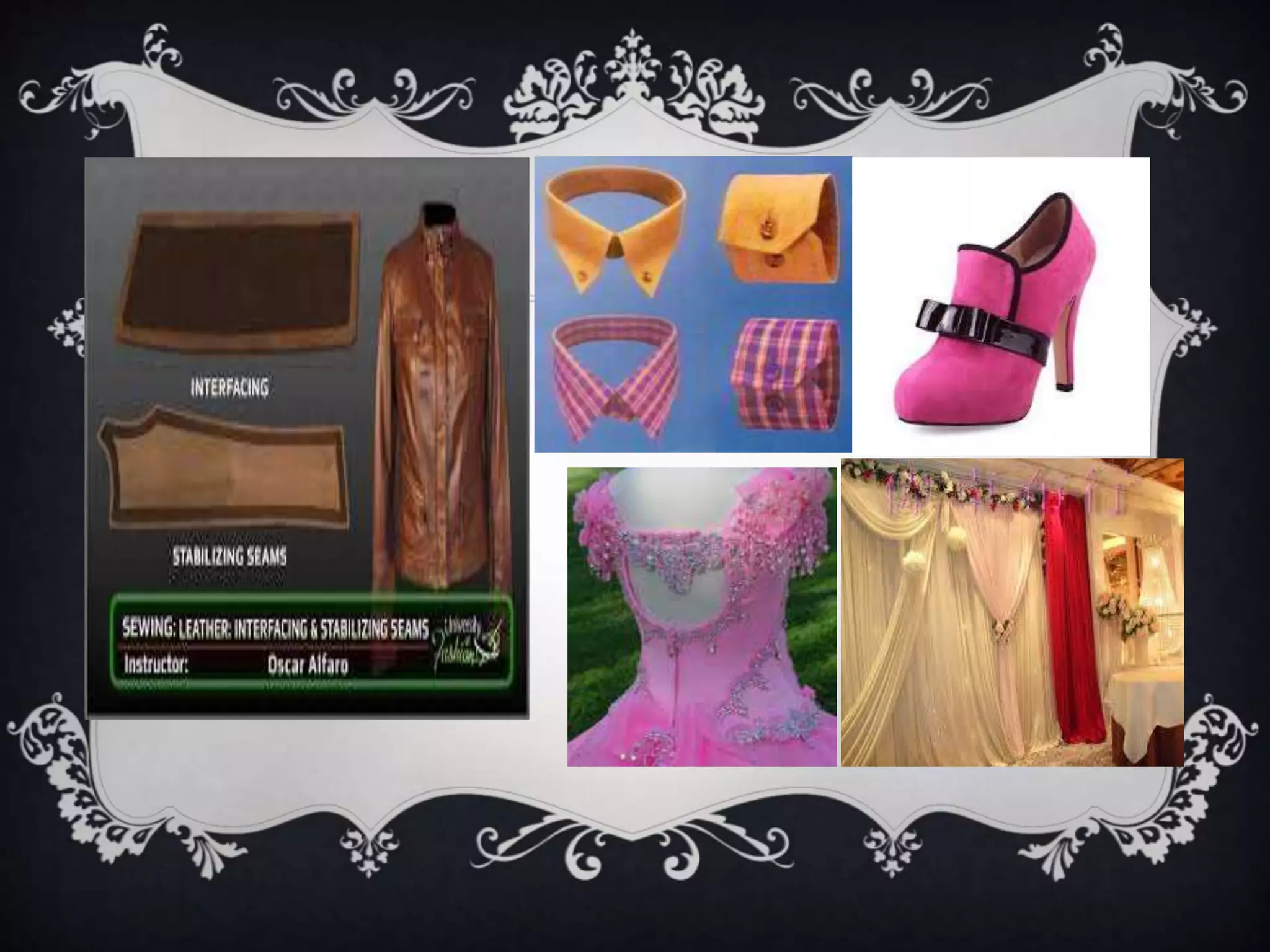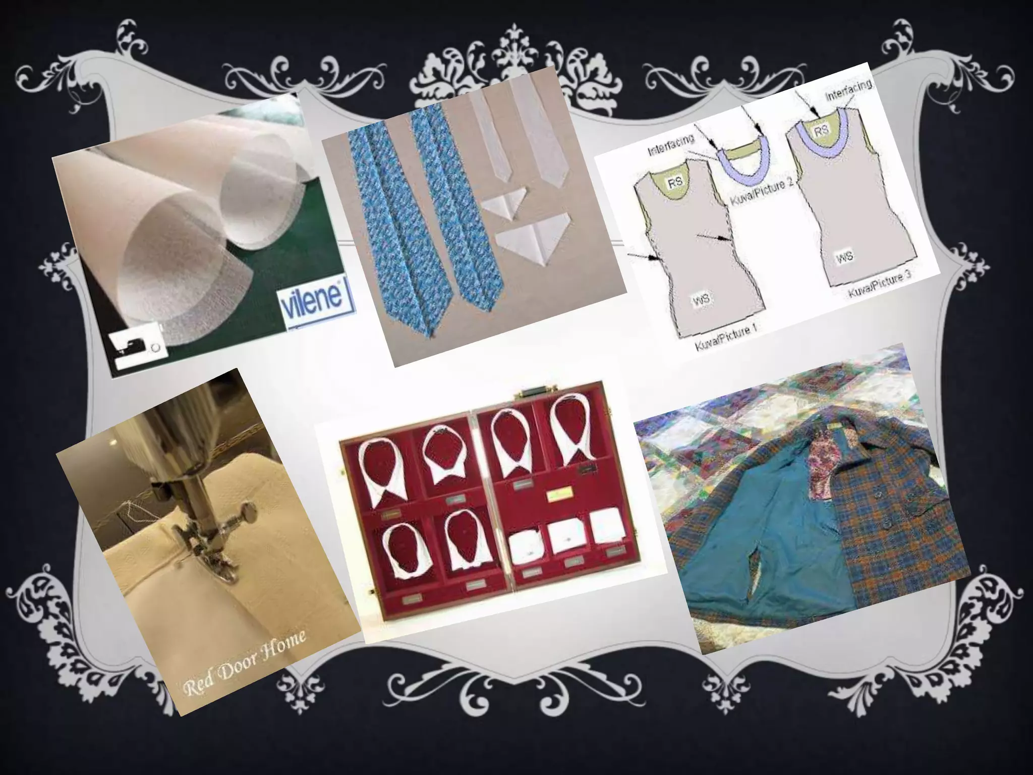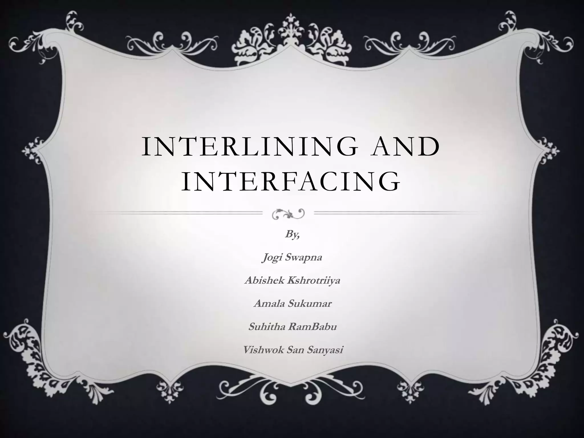 This document discusses interlining and interfacing used in apparel manufacturing. It defines interlining as an additional layer of fabric between the lining and outer shell, while interfacing is a material used between facings and the outer shell, such as on collars and cuffs. The document describes the two types of interlining as non-fusible and fusible, and lists common materials like cotton and synthetic fabrics. It explains that interlining and interfacing are used to support garments, control shape and areas, and reinforce components. The document provides examples of applications, such as using interfacing on jackets and interlining on kameez and lehangas.