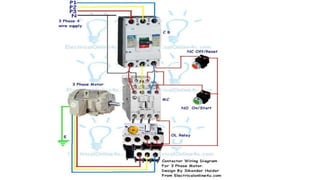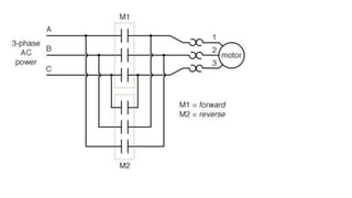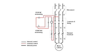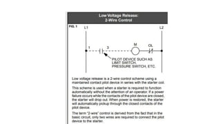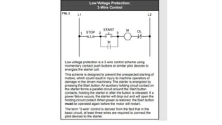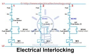 The document discusses sequencing and interlocking for motors. It covers standard electrical symbols used in wiring diagrams as they relate to motors. It discusses concepts like sequencing, interlocking, starting, stopping, emergency shutdown, protection methods for motors like short circuit, overload, low voltage, phase reversal and overtemperature protection. It also covers reversing motor direction, braking, variable speed starting, jogging/inching. Motor control centers and their wiring diagrams are also mentioned. Induction motors and their working principle is briefly explained. The document provides examples of sequencing, interlocking, automatic sequence control and how to prevent short circuits in control system designs. It discusses manual and magnetic motor starters as well as their circuitry including 2 wire and 3 wire