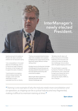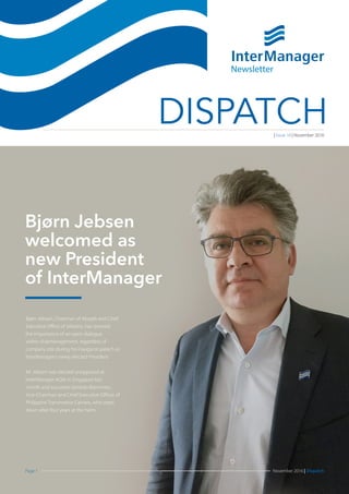 Bjørn Jebsen was elected as the new President of InterManager at their AGM in Singapore last month. In his inaugural speech, Mr. Jebsen emphasized the importance of open dialogue within shipmanagement and supporting seafarer careers. He aims to encourage cooperation between ship managers, owners, and other stakeholders to build a sustainable future for the shipping industry. Training is one area that could benefit from more consolidation between companies. The Secretary-General of InterManager welcomed Mr. Jebsen's appointment and believes he will provide strong leadership.