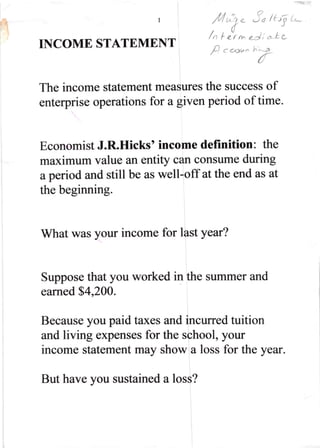 The income statement measures the success of a business over a period of time. It assesses revenues earned and expenses incurred. However, income totals can be affected by accounting methods used and involve judgement in some cases. Determining what is included in net income, such as irregular gains and losses, is an issue because it impacts the portrayal of a company's performance. There are debates around whether irregular items should impact net income or be directly reflected in retained earnings.