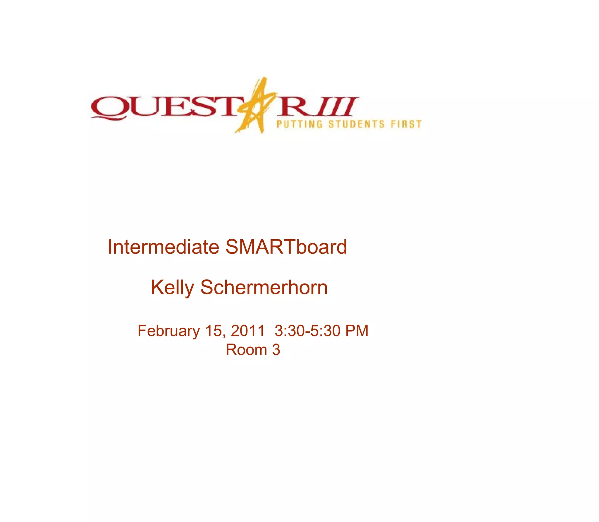 This document summarizes an upcoming intermediate SMARTboard training session. The session will cover reviewing SMART toolbars and software, the Lesson Activity Toolkit for finding and modifying lessons, and how to create, share, and modify lessons. Attendees will receive handouts and have a chance to ask questions and begin creating lessons using materials from the trainer's templates and folders.
