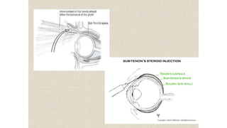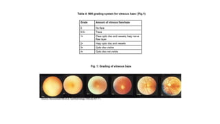 Intermediate uveitis (IU) is an idiopathic inflammatory syndrome involving the anterior vitreous, peripheral retina, and ciliary body, characterized by vitreous cells and debris, pars plana exudates, and mild periphlebitis. The hallmark findings are white or yellowish exudates ("snowballs" or "snowbank") in the pars plana region. Treatment involves a stepwise approach starting with periocular or systemic corticosteroids, then cryotherapy or laser, vitrectomy if needed, and finally immunosuppressants. Complications can include cystoid macular edema, cataracts, glaucoma, and retinal detachment if left untreated. Dif