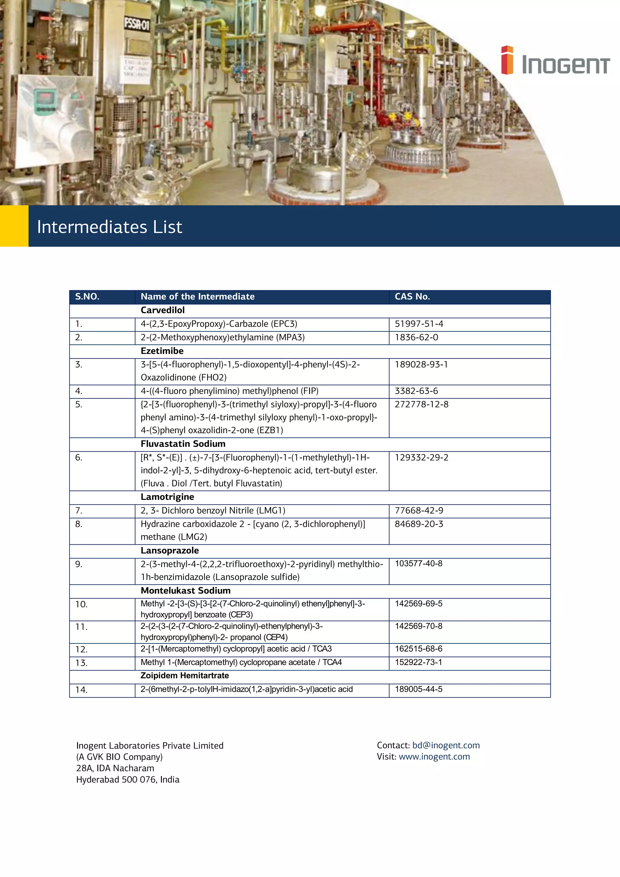 This document lists 14 intermediates used in pharmaceutical manufacturing along with their CAS numbers. The intermediates include carvedilol, ezetimibe, fluvastatin sodium, lamotrigine, lansoprazole, montelukast sodium, and zoipidem hemitartrate. Information provided includes the name of each intermediate, its corresponding CAS number, and in some cases additional chemical identifiers. The intermediates support the production of various active pharmaceutical ingredients.