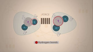 This document discusses intermolecular forces, including what they are and different types. The main types discussed are ion-dipole forces, dipole-dipole forces, and Van der Waals forces. Ion-dipole forces occur between an ion and a molecule with a dipole. Dipole-dipole forces occur between polar molecules that have partial charges, like water molecules. Van der Waals forces are weak electrostatic attractions between all molecules, even non-polar ones, due to temporary charge distributions. These intermolecular forces are important for determining the properties of liquids and solids.