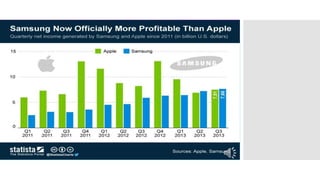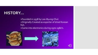 Samsung Electronics, founded in 1938, has grown to become the world's largest manufacturer of mobile phones and televisions, leveraging strong manufacturing, marketing, and research capabilities. While facing competition from Chinese brands and Apple, it sees opportunities in the expanding smartphone market and aims to reach $400 billion in sales by 2020 through international expansion and innovation. The company emphasizes unique advertising strategies and has established significant sponsorships to enhance brand visibility.