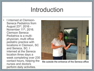 Rachel Brown interned at Clemson-Seneca Pediatrics from August to November 2016, assisting nurses and doctors at their Seneca, SC location. She gained over 230 hours of experience helping with daily tasks like preparing exam rooms, taking patient vitals, performing lab tests, and assisting with procedures. Her major project was creating a new lab book compatible with the practice's new electronic medical records system. The internship provided valuable hands-on experience in a pediatric clinical setting and reinforced her choice to work in healthcare."