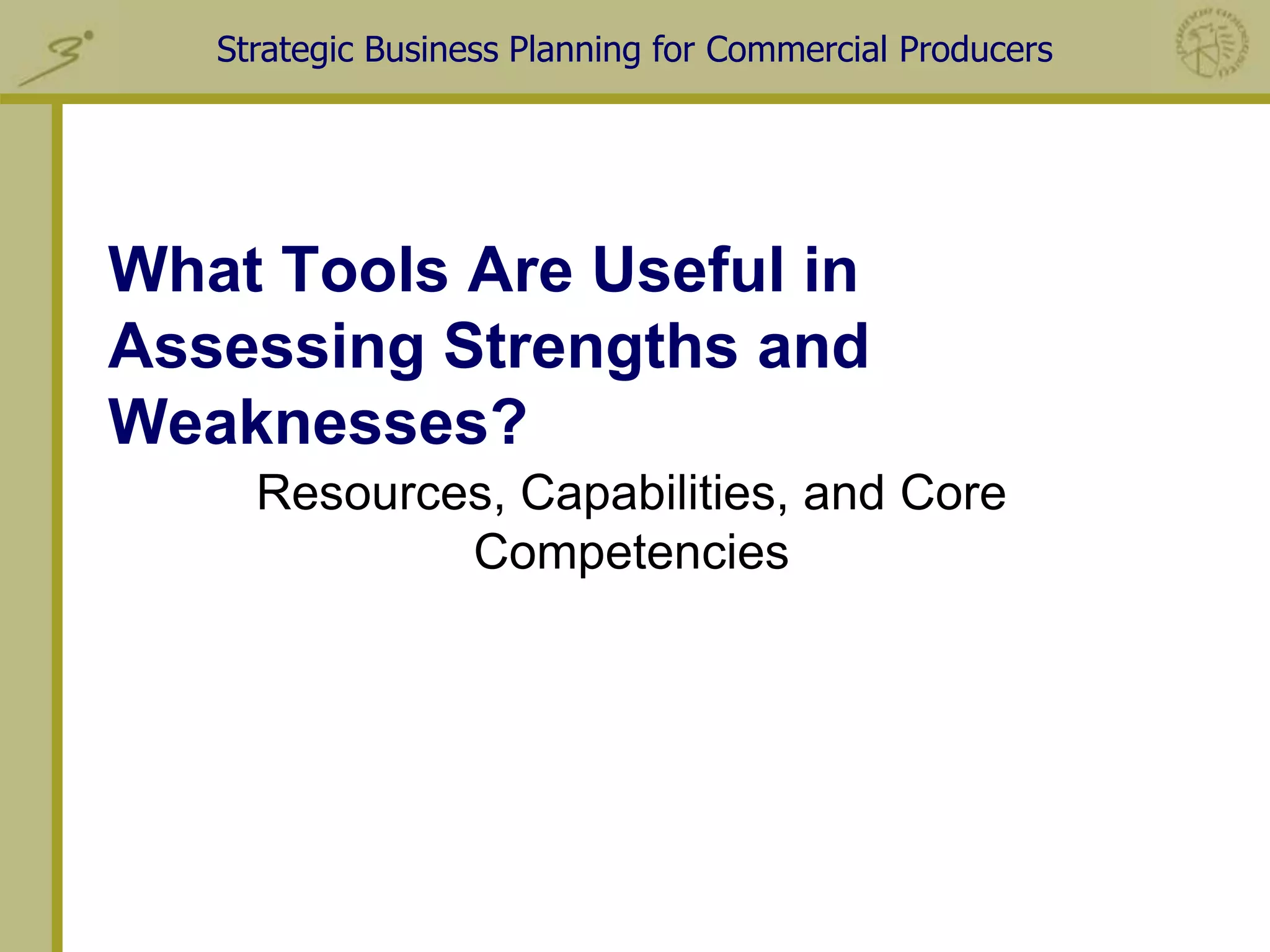 This document discusses tools for assessing a business's strengths and weaknesses as part of strategic planning. It describes resources, capabilities, and core competencies as important to evaluate internally. The value chain framework can help identify core competencies by analyzing each step in the chain from procurement to outbound logistics to marketing. Mapping activities in this way reveals relative costs and sources of competitive advantage to maximize margins.