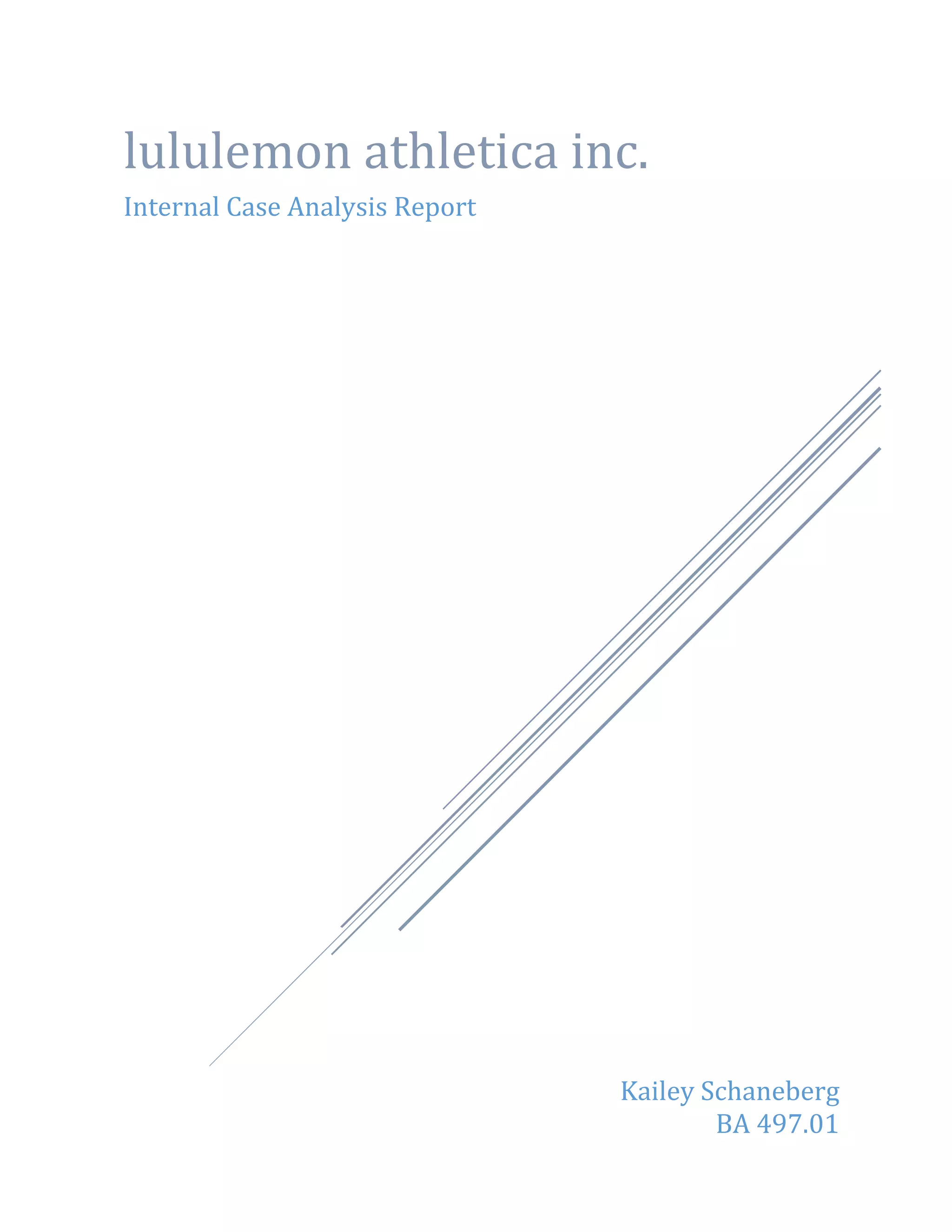 The document is an internal case analysis report for lululemon athletica inc. prepared by Kailey Schaneberg for CEO Laurent Potdevin. It provides background on lululemon's success and challenges, including a product recall and leadership transitions that hurt growth. An analysis of lululemon's strengths, weaknesses, opportunities, and threats is presented. The memo recommends that lululemon create an exclusive multi-site fitness membership program, acquire the company that manufactures its Luon fabric to improve quality control and lower costs, expand its men's product line to include traditional sports apparel, and expand its brand ambassador program to professional athletes. Further details supporting these recommendations are attached.