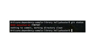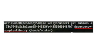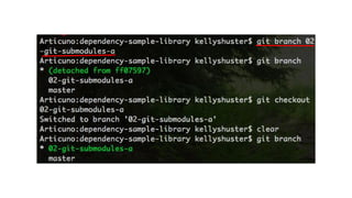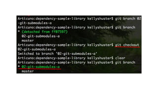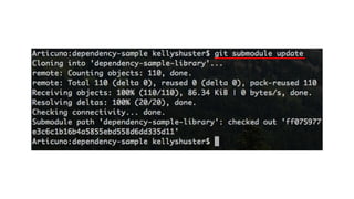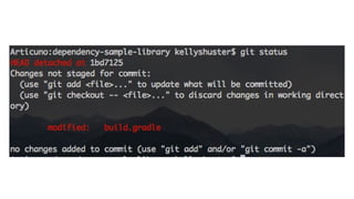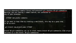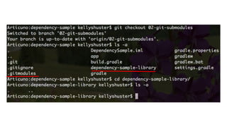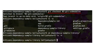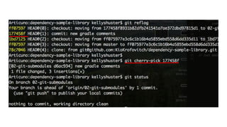 The document details the management of internal library dependencies using tools like Git submodules, Google's repo tool, Artifactory, and JitPack. It covers setup instructions, versioning pros and cons, and specific Gradle configurations for publishing and including libraries. It highlights the complexities of handling detached heads and the importance of version control in Android Studio projects.
