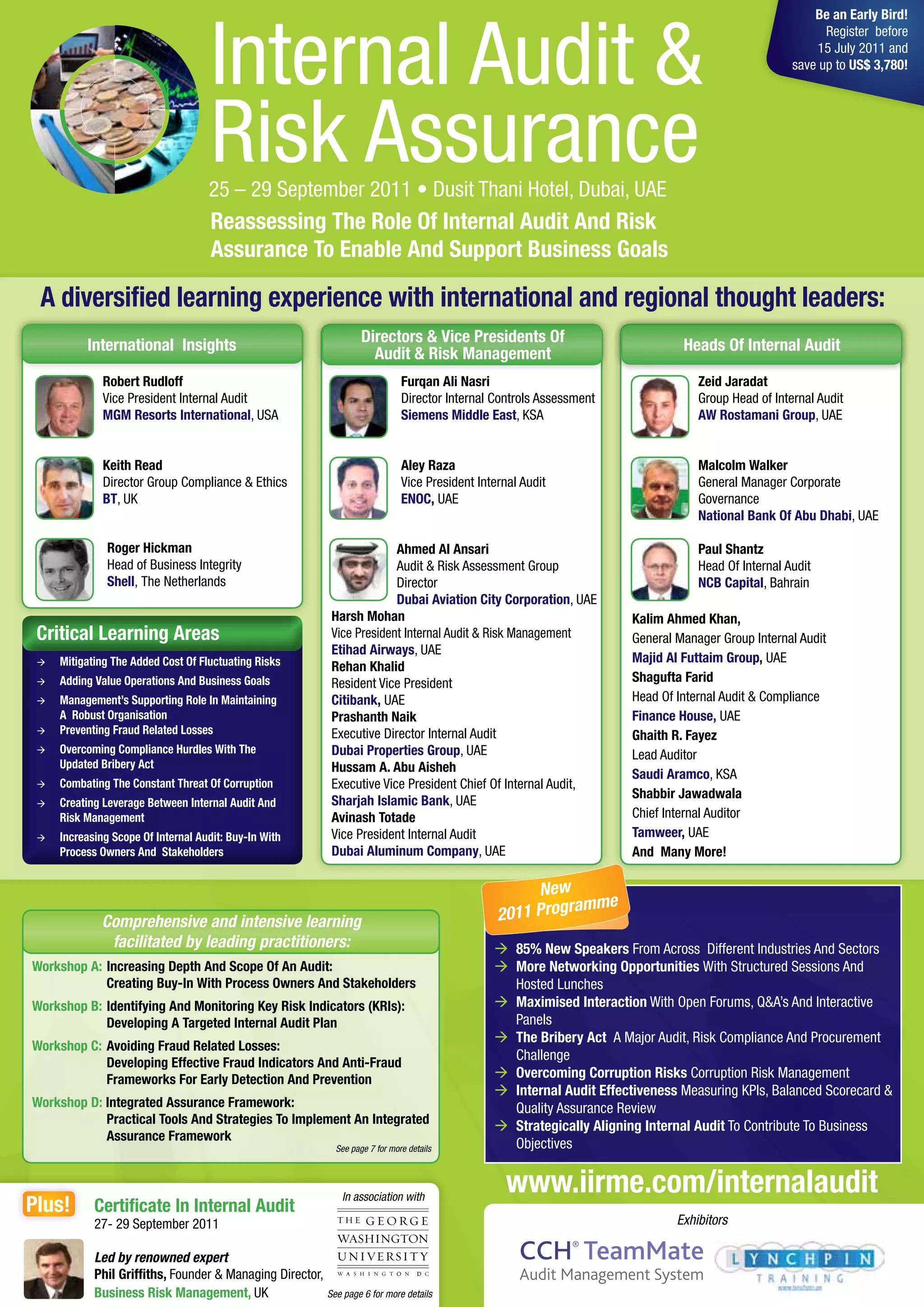 The document provides information about an upcoming internal audit and risk assurance conference to be held from 25-29 September 2011 in Dubai, UAE. The conference will feature over 20 leading experts from various industries sharing their insights on critical topics such as mitigating risks, adding value, preventing fraud losses, and combating corruption. Participants can attend workshops on increasing audit scope and identifying risks, as well as earn a Certificate in Internal Audit. The agenda on the first day includes sessions on the evolving role of internal audit, metrics and effectiveness, corporate governance, and fraud prevention.