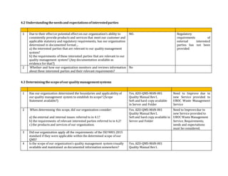 This document contains an audit checklist for an organization's quality management system. It assesses how the organization has addressed key requirements of ISO 9001:2015 related to understanding the context of the organization, needs and expectations of interested parties, scope of the quality management system, leadership and commitment to quality, and roles and responsibilities. The audit found the organization needs to improve in areas like documenting processes and risks, updating procedures for new services, developing performance indicators, and ensuring top management involvement through activities like internal audits and management reviews.
