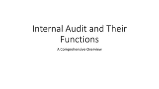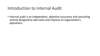 Internal audit is an independent activity aimed at enhancing organizational operations through risk management, compliance, and efficiency. Its key functions include assessing controls, reviewing information, and investigating fraud. The importance of internal audits lies in their ability to improve governance and safeguard assets.