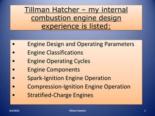 Tillman Hatcher's experience with internal combustion engine design includes over 150 topics related to engine components, operation cycles, performance characteristics, emissions, heat transfer, friction, lubrication, modeling, and more. His expertise spans spark-ignition engines, compression-ignition engines, and alternative engine technologies.