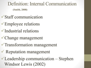Internal communication refers to communication within an organization between employees. It has evolved over three stages from focusing on individuals and camaraderie, to delivering news and facts, to now implementing strategy and strategic objectives. Good internal communication is measurable, two-way, accurate, honest, inclusive, comprehensible, timely, and competently prepared and delivered. Conducting a communication audit is an important tool for organizations to build an effective internal communication strategy by surveying management and employees, assessing discrepancies, and providing recommendations. The goal of internal communication is to ensure information is understood by employees in supporting the implementation of the organization's overall strategy.