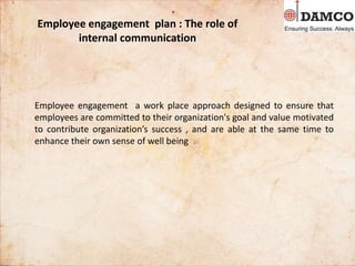 This document presents an employee engagement plan for Damco. It discusses the importance of employee engagement and commitment for organizational success. It proposes several strategies to enhance employee engagement at Damco, including establishing a strong and communicated vision, consistent internal communication, supportive supervision, employee development opportunities, a culture of trust, rewards and recognition, knowledge sharing systems, celebrating achievements and people, empowering employees, and measuring engagement through key metrics. The plan will be implemented over January 2016 at Damco's Noida location to engage all employees.