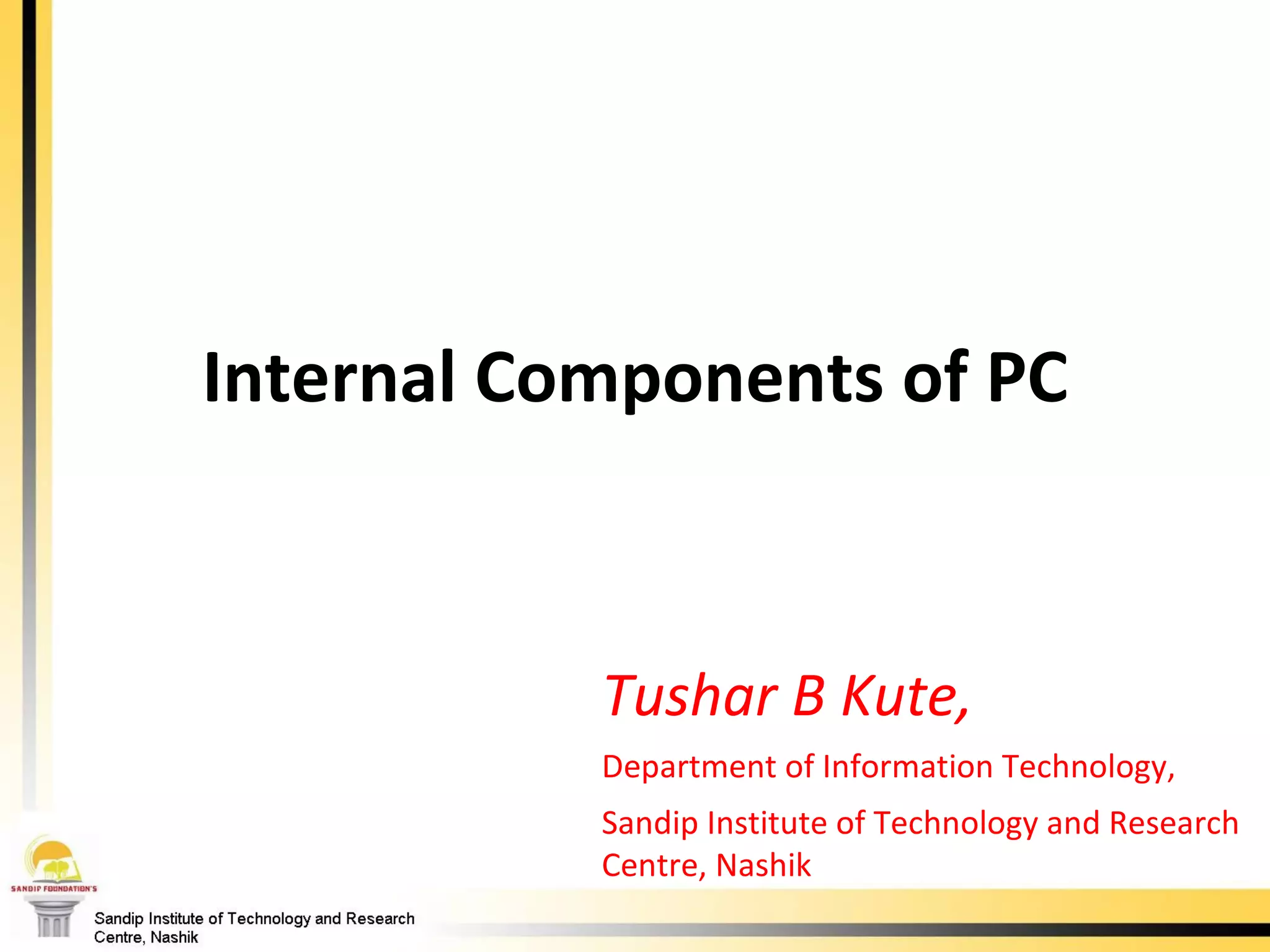 The document provides a comprehensive overview of the internal components of a PC, detailing the functions and characteristics of the motherboard, CPU, RAM, ROM, and CMOS memory. It explains memory types, data buses, expansion slots, and different form factors, along with their roles in connecting peripherals and handling data processing. Additionally, it outlines various expansion cards and bus technologies that enhance a PC's capabilities.
