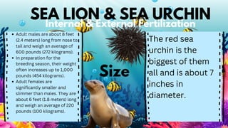 The document compares and contrasts reproduction in California sea lions and sea urchins. California sea lions practice internal fertilization, with males mating with multiple females and a long gestation period. Pups are born on land and require parental care. In contrast, sea urchins practice external fertilization through the release of eggs and sperm into the water, with a high rate of gamete wastage and no parental care of offspring. Both species have a long period to reach sexual maturity.