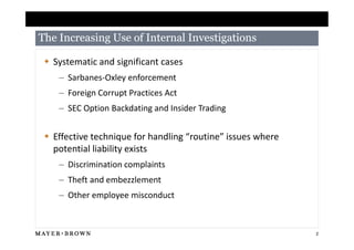 1) The document discusses conducting internal investigations within companies. It covers topics such as when internal investigations are triggered, how to conduct them, and whether an independent committee is needed to oversee the investigation.