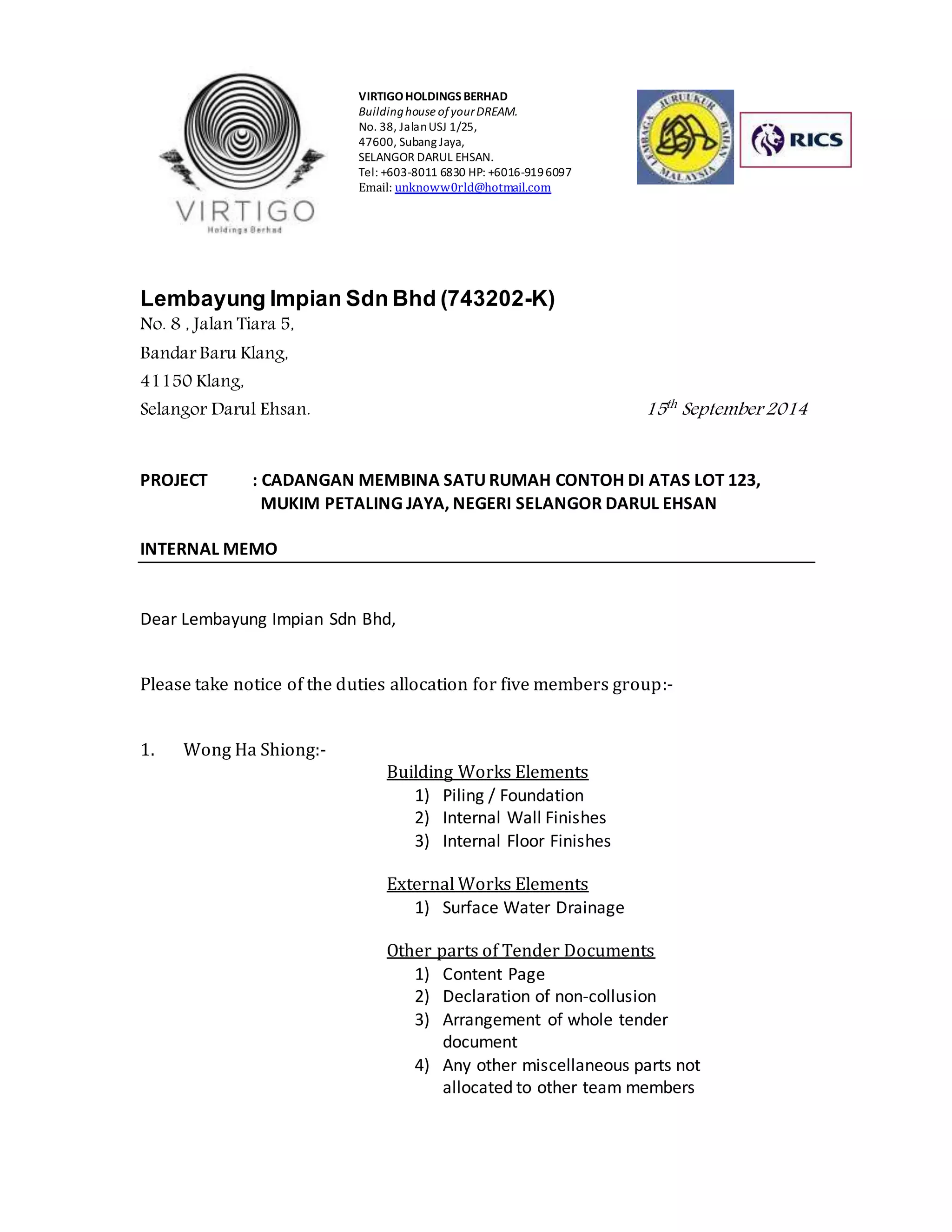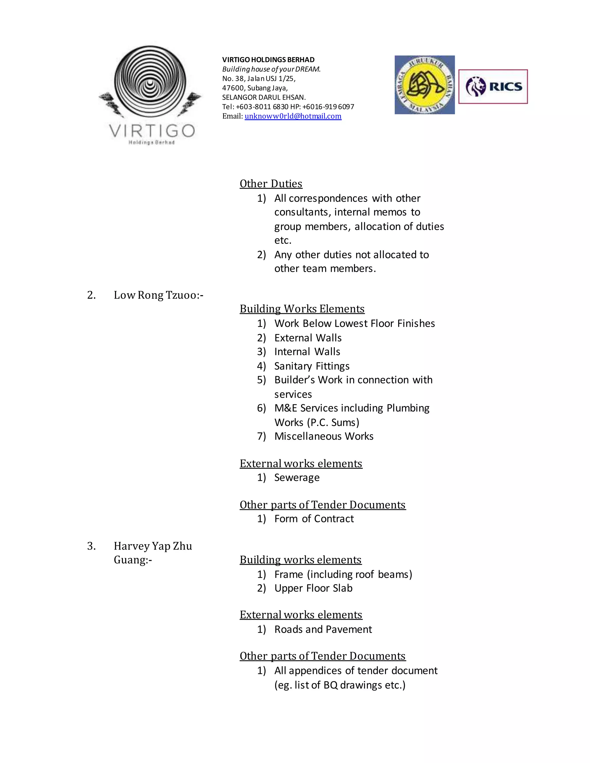 This document assigns duties for five members to work on tendering for a proposed house construction project. Wong Ha Shiong is responsible for building works elements like piling and foundations, internal wall and floor finishes, and surface water drainage. Low Rong Tzuoo will handle work below the lowest floor, external walls, internal walls, sanitary fittings, and plumbing works. Harvey Yap Guang is tasked with the building frame, upper floor slab, and roads/pavement. Yam Yih Hwan will cover the roof, staircase, water reticulation, and fencing. Ng Jun Keat is assigned windows, doors, ceilings, external finishes, and refuse/letter boxes.