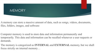 Internal memory, referred to as primary memory, stores essential data for quick access during computer operation, including volatile types like RAM and non-volatile types like ROM. RAM is a temporary storage that allows for fast data access but loses information when powered off, while ROM retains data permanently and is used for boot instructions. Key characteristics of internal memory include limited capacity, high access speed, and cost considerations.