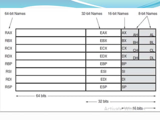 3. Details about general purpose registers like RAX, RBX, RCX, RDX and segment registers.