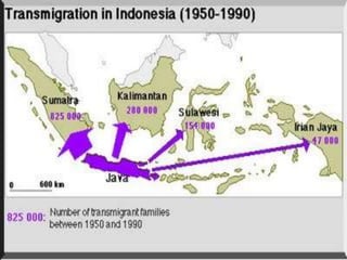 Internal migration in Indonesia involves the transmigration program which aims to redistribute population from densely populated Java to less populated outer islands. The government provides assistance to migrants moving from source areas like Java, Bali, and Madura to destination areas such as South Sumatra, Sulawesi, Kalimantan, and Irian Jaya. While this reduces population pressure on Java, it also displaces indigenous groups and changes the ethnic composition of destination areas.