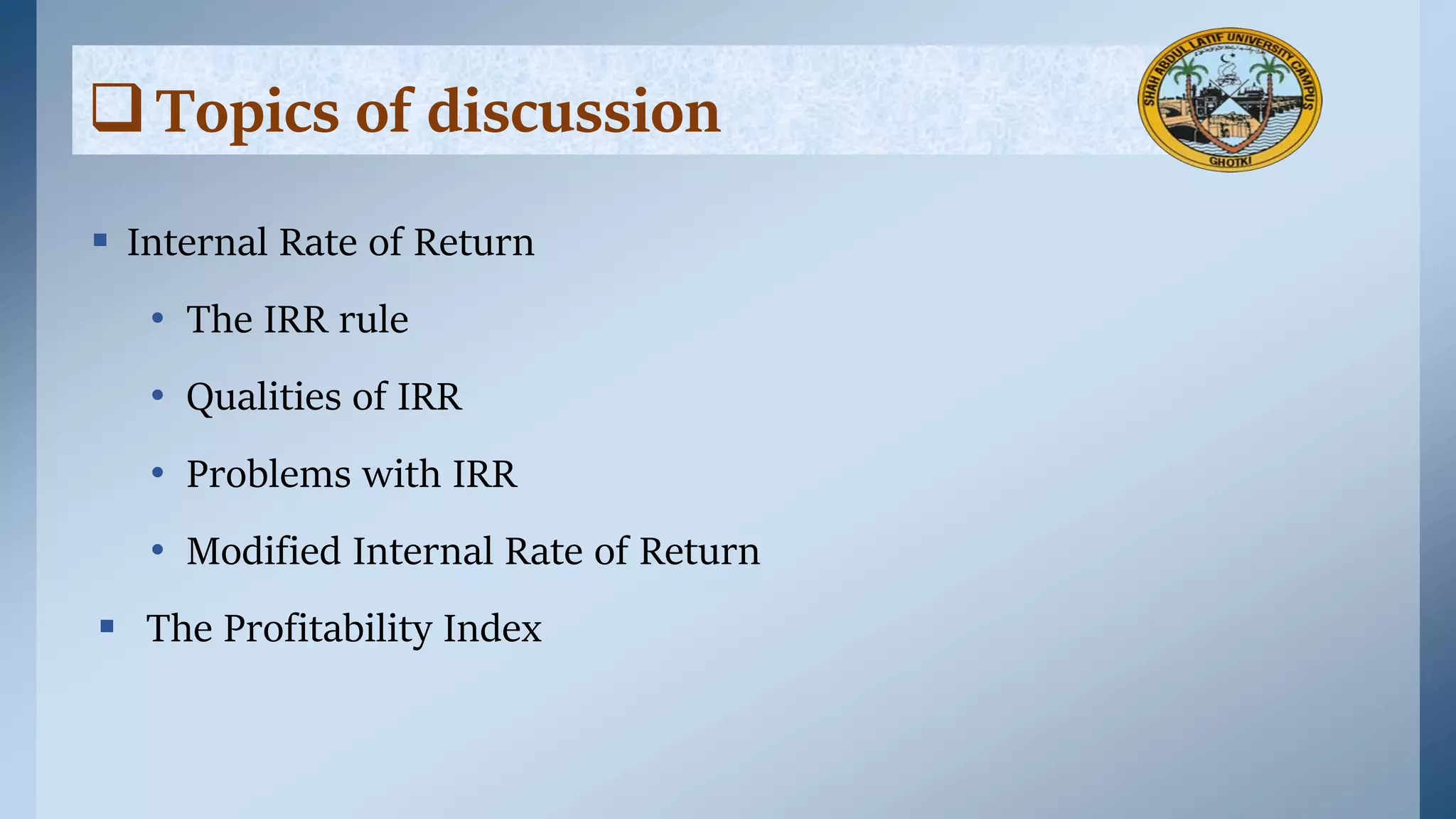 The document discusses various investment evaluation criteria, focusing on the Internal Rate of Return (IRR) and its applications in project evaluation. It explains concepts such as the IRR rule, its calculation for different cash flow scenarios, problems associated with using IRR, and introduces the Modified Internal Rate of Return (MIRR) and Profitability Index (PI) as alternative measures. The overarching theme emphasizes the importance of selecting appropriate financial metrics based on specific project requirements and investment scenarios.