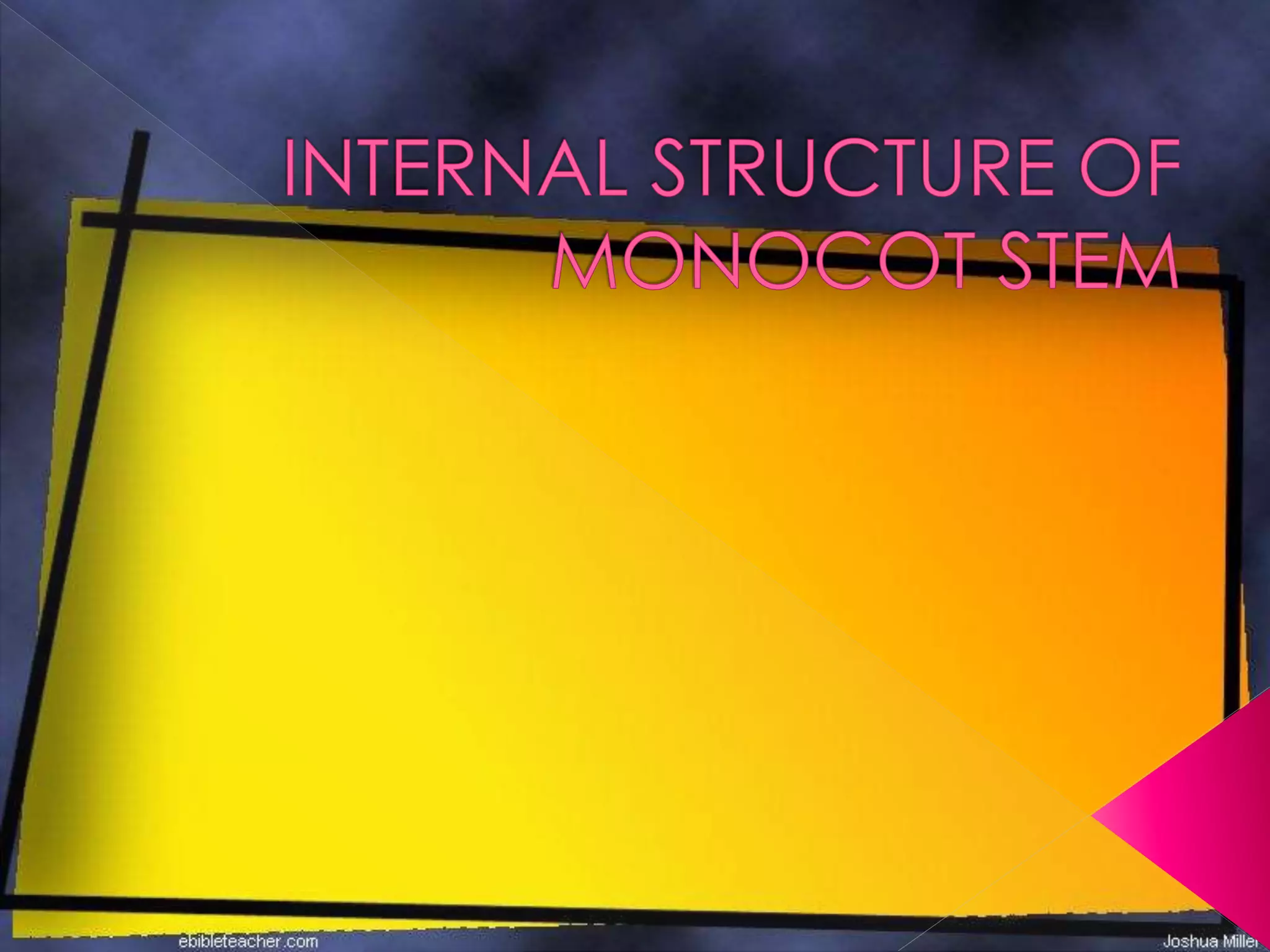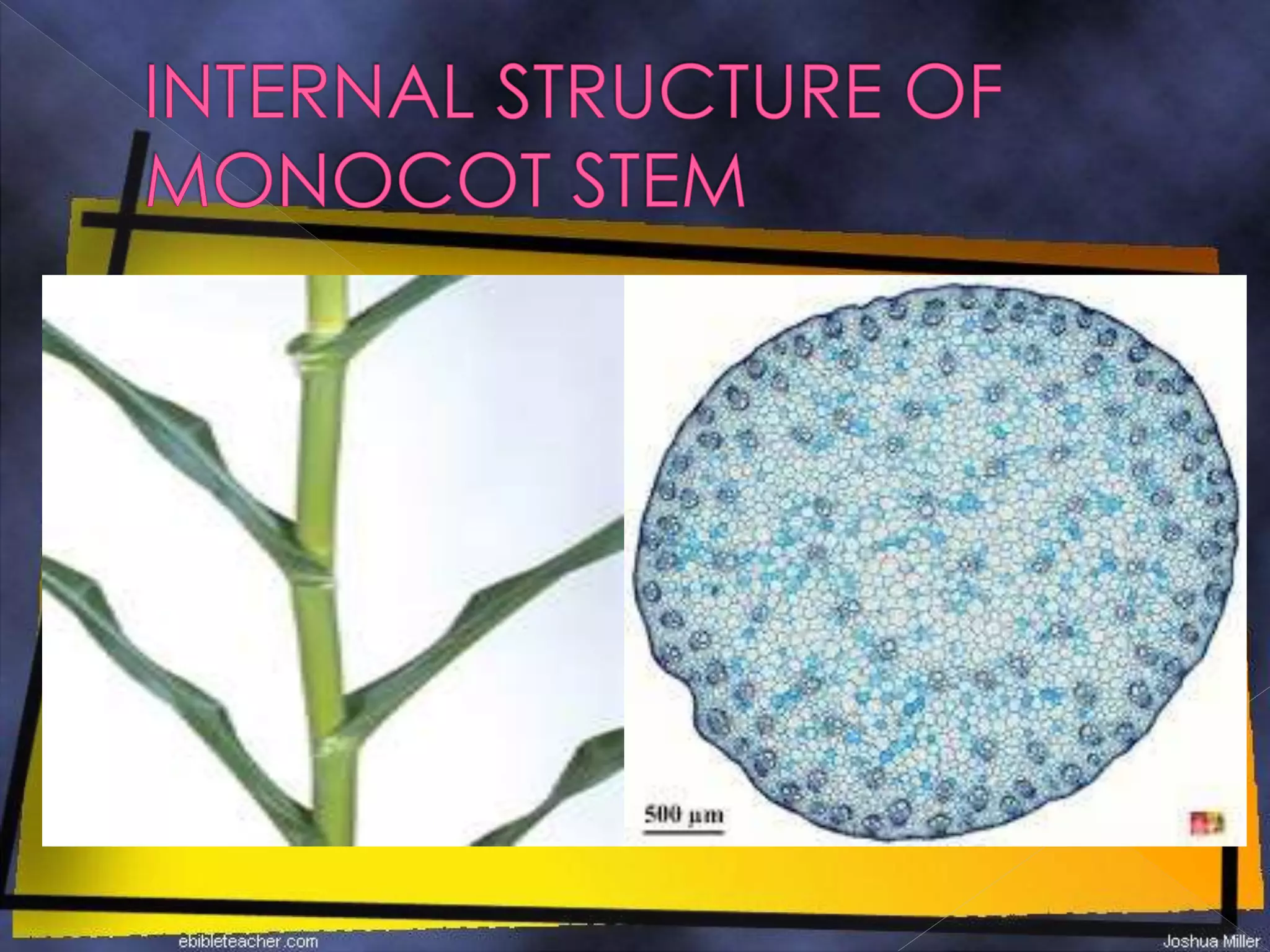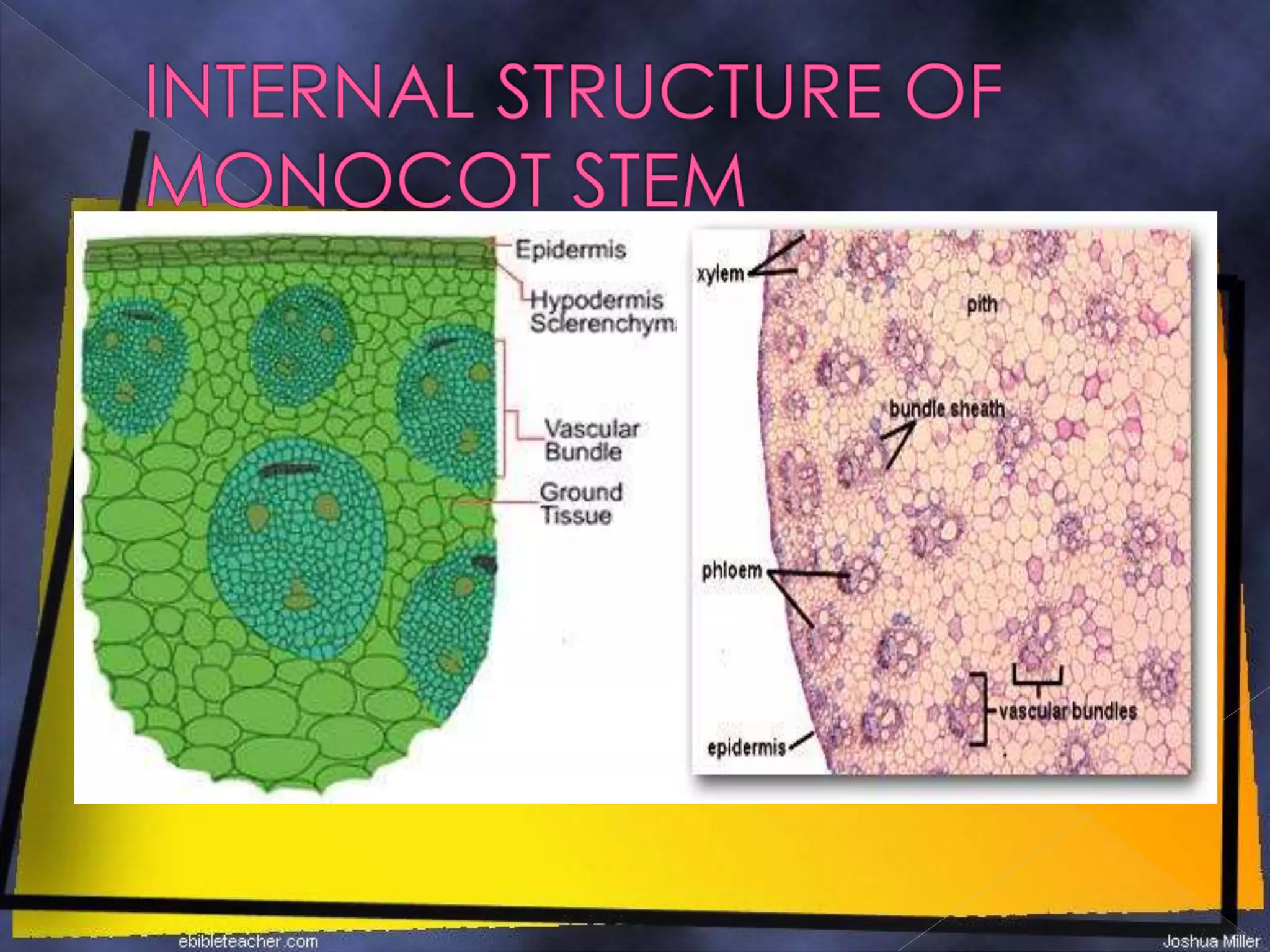 The epidermis is a single layer of compact parenchyma cells with a cuticle and stomata. Below this is the hypodermis of compact sclerenchyma cells. The ground tissue makes up most of the stem and contains loosely arranged parenchyma cells with spaces. Vascular bundles are irregularly scattered throughout the ground tissue and each has a sclerenchyma bundle sheath. The bundles are conjoint, collateral and closed with endarch xylem formation.