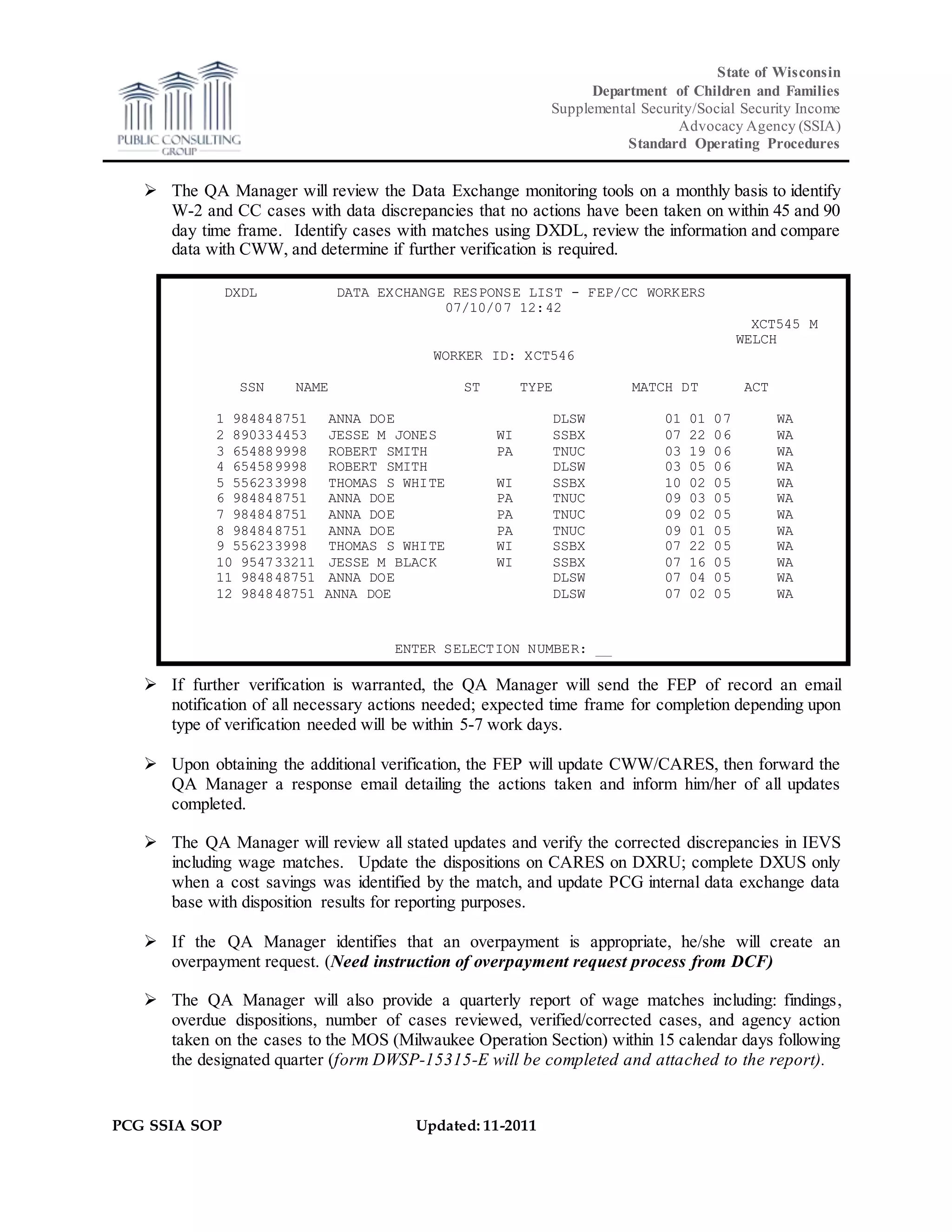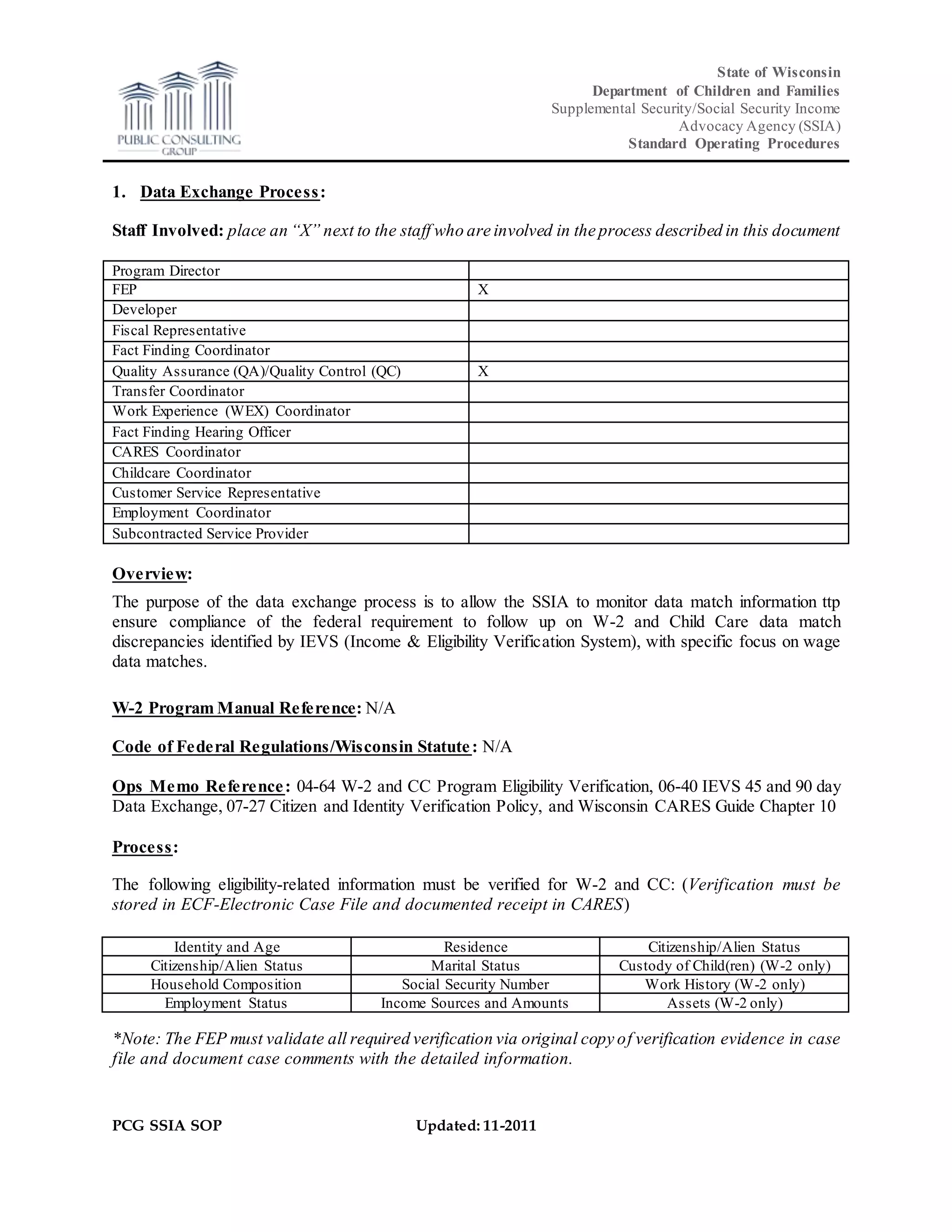 The document outlines standard operating procedures for a Supplemental Security/Social Security Income Advocacy Agency regarding its data exchange process. It describes staff involved in the process, including fact finders, quality assurance personnel, and fiscal representatives. The purpose is to monitor data match information to ensure compliance with federal requirements to follow up on discrepancies identified through income and eligibility verification. It details the process by which quality assurance managers review data exchange monitoring tools to identify cases requiring further verification, notify fact finders, update case records upon verification, and report findings quarterly.