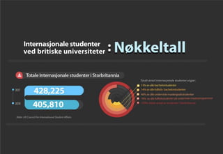Noen viktige statistikker om internasjonale studenter generellt i Storbritannia I tilegg til Norske Bachelor og Master elever som studerer ved noen av de beste universitetene i Storbritannia. Les mer pa: http://no.studyacrossthepond.com/infographic.asp