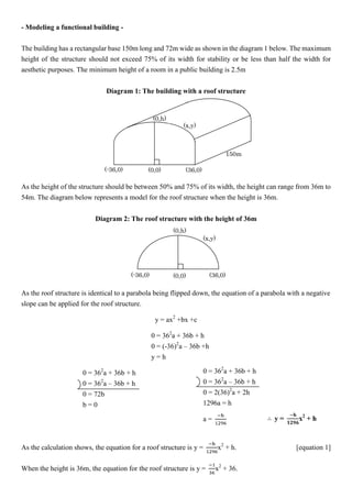 1) Equations to model the roof structure as a parabola based on the building dimensions and stability/aesthetic requirements.