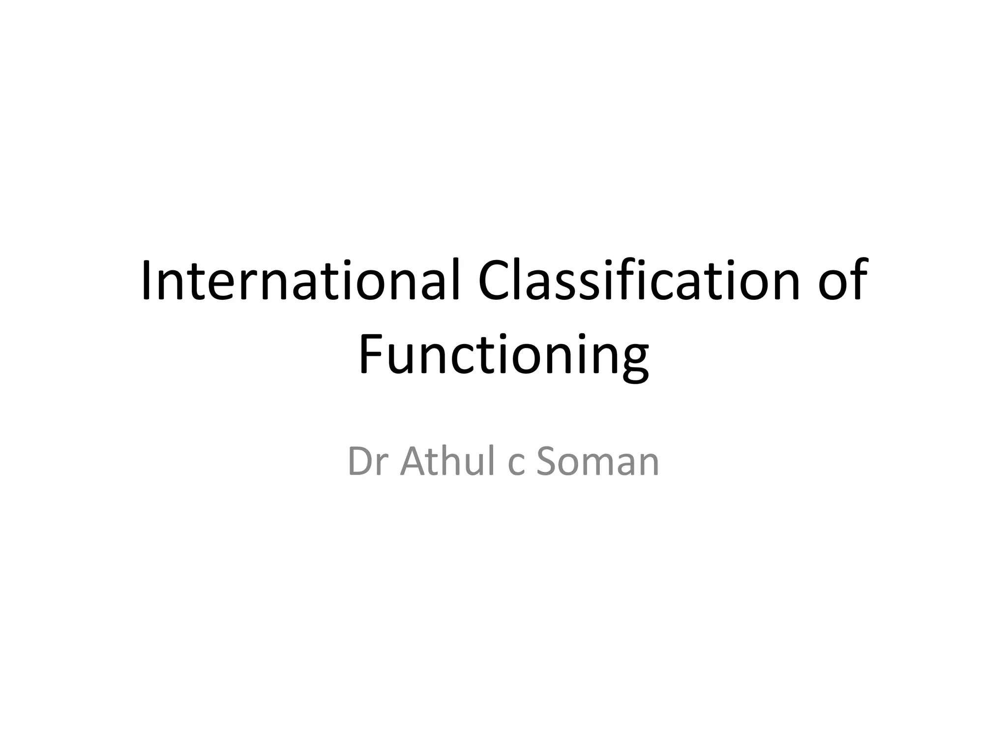 The document discusses the International Classification of Functioning (ICF) framework developed by the World Health Organization (WHO). It provides a standardized language for classifying and describing human functioning and disability. The ICF aims to establish a common language to improve communication about health and disability across countries, disciplines, services and time. It takes a holistic and interactive approach by considering body functions and structures, activities, participation and environmental factors. The ICF can be applied across various sectors like health, education, labor and policymaking.