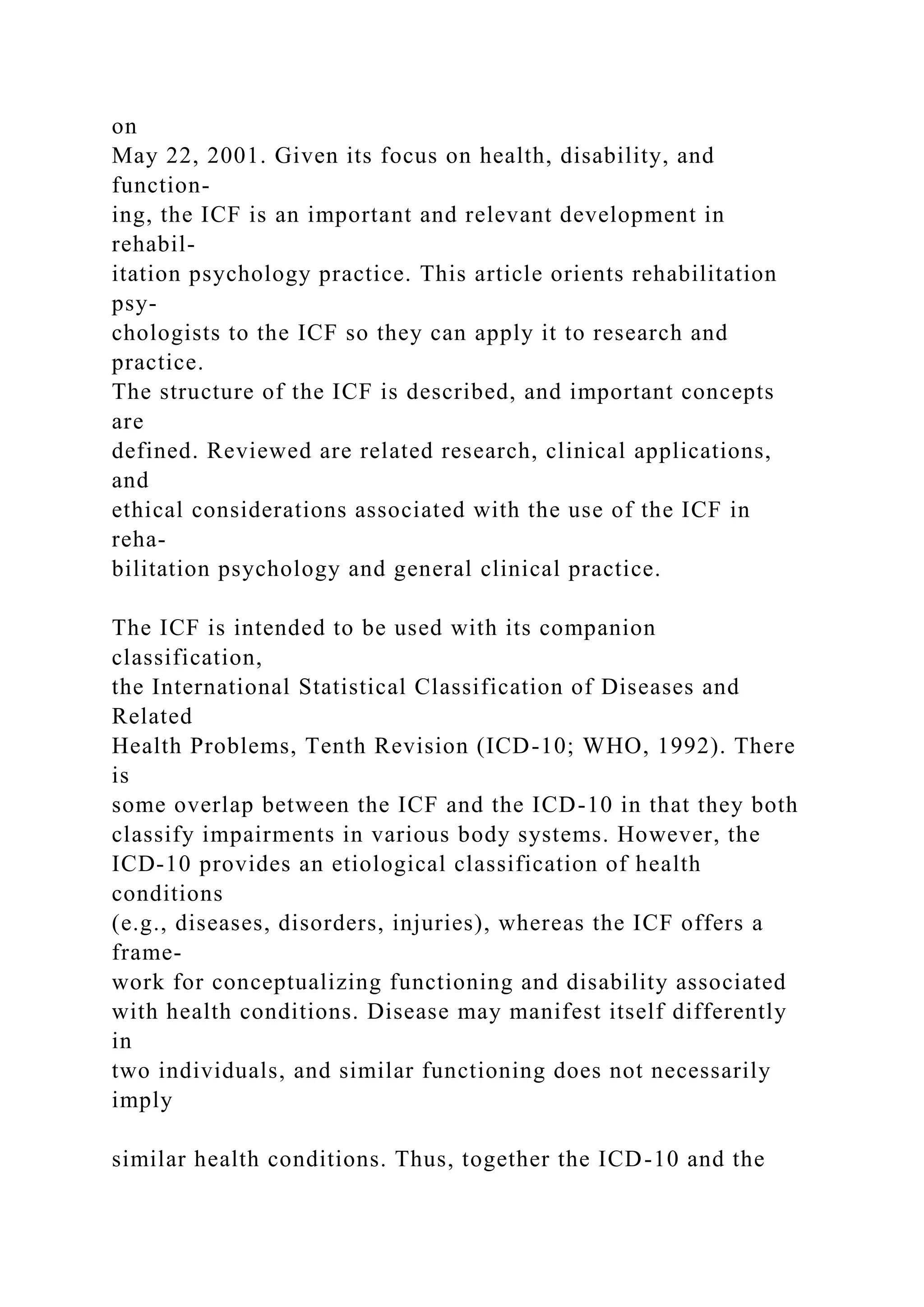 The International Classification of Functioning, Disability and Health (ICF) is a comprehensive framework designed for rehabilitation psychologists to classify health and functioning. It emphasizes the dynamic interaction between body functions, activities, participation, and contextual factors, integrating both medical and social models of disability. The ICF aims to provide a meaningful perspective on health that can enhance research and clinical practice while being endorsed by the World Health Organization for global use.