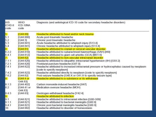 1. The document discusses the International Classification of Headache Disorders (ICHD), which provides a standardized system for classifying headaches to facilitate communication between professionals, research, and treatment guidelines.